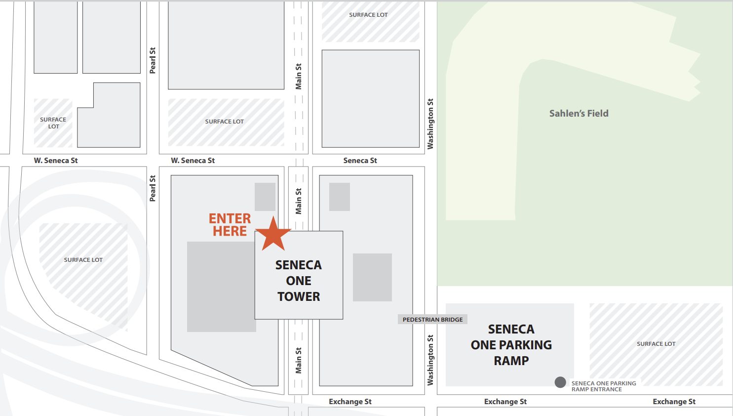 Parking and Entrance: Street parking can be found on the perimeter of the tower, however, if you would prefer to park in a garage Seneca One has a ramp at 50 Exchange Street. Parking costs $3 – 5 and there is a pedestrian bridge connecting the garage to the tower located on the third floor. For detailed instructions head to Seneca One’s parking instructions page. Please also consider taking the NFTA rail whose Seneca Street Station is roughly a 30 second walk from the entrance to the Tower.