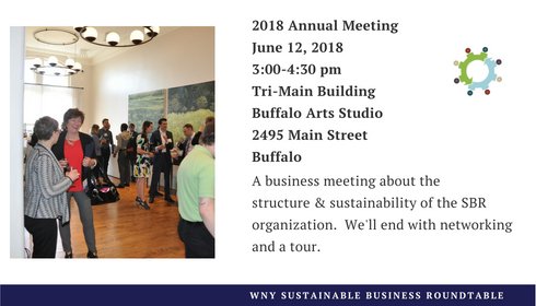 Join us for the WNY Sustainable Business Roundtable (SBR) Annual Member’s Meeting on June 12 from 3-4:30 pm at TriMain in the Buffalo Arts Studio. The meeting will include “A Year in Review”, Committee Reports, Next Steps, Board Elections, and Bylaw approval. Afterwards we will have networking and a tour. Non-members are welcome.